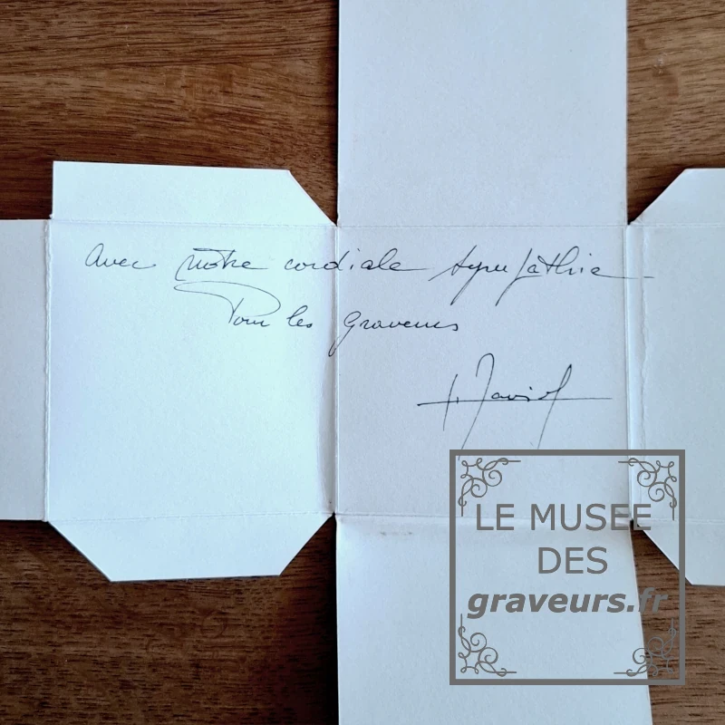 Carte de vœux pliante de la Monnaie de Paris, contenant à l’intérieur le message : Avec notre cordiale sympathie pour les graveurs, Jacki Mauviel.